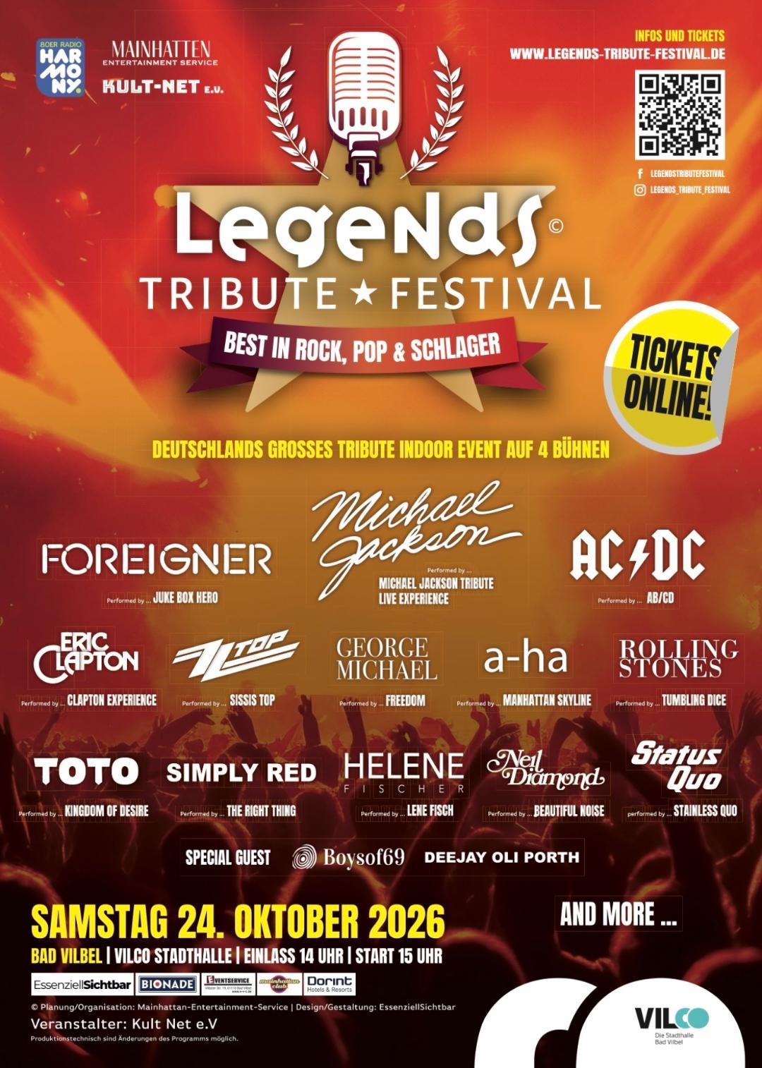 Ab sofort sind Tickets für das LEGENDS TRIBUTE FESTIVAL am 24.10.2026 in der VILCO / Bad Vilbel, in fast allen Kategorien bei KultNet e.V. / Eventim und Frankfurt Ticket zu erwerben.